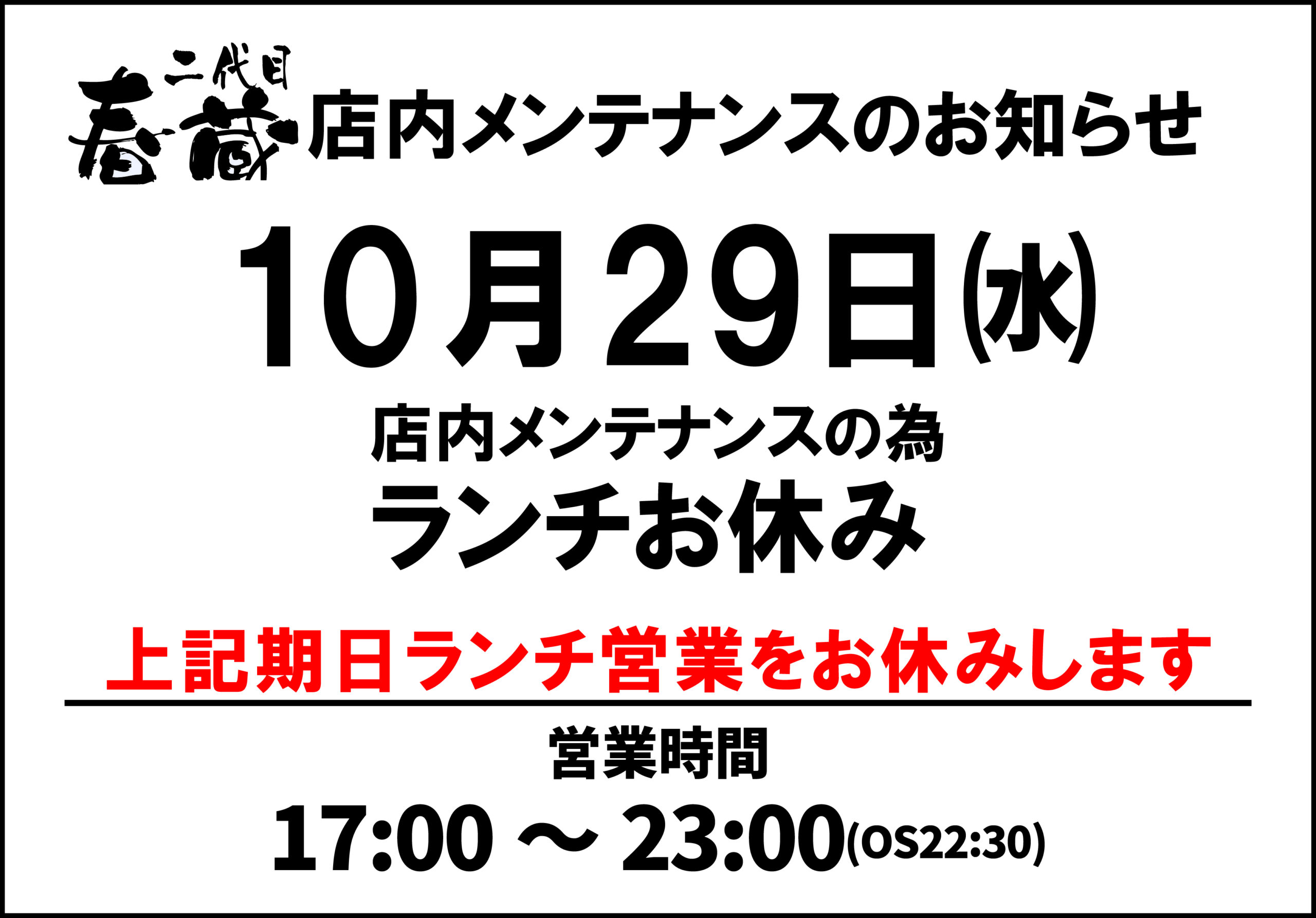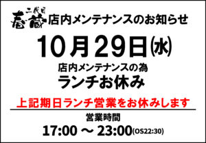 10月29日ランチお休みのお知らせ 公開日:2025年10月25日 日頃のご愛顧誠にありがとうございます。 10月29日㈬は店内メンテナンスの為ランチの営業をお休みさせていただきます。 営業開始は17:00からとなります。 ご理解のほどよろしくお願いいたします。